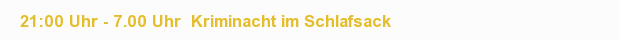 Unser Kriminachtexperte Stefan wird schaurig, schöne Spuk-, Krimi- und Schauergeschichten erzählen. Wie immer gibt es einen Mitternachtsimbiss und ein Frühstück. Geschlafen wird im Schlafsack.